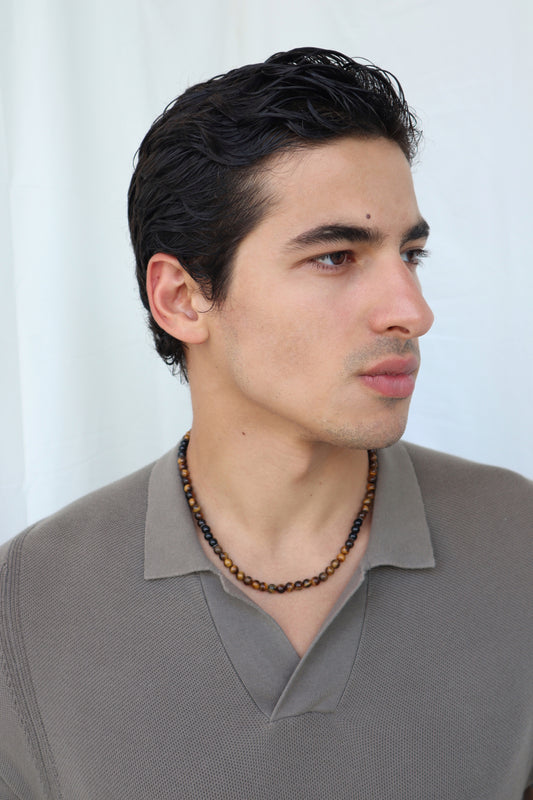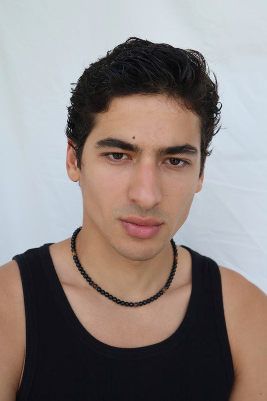 Mens Tiger’s Eye & shiny Onyx beaded Necklace | 925 Sterling Silver