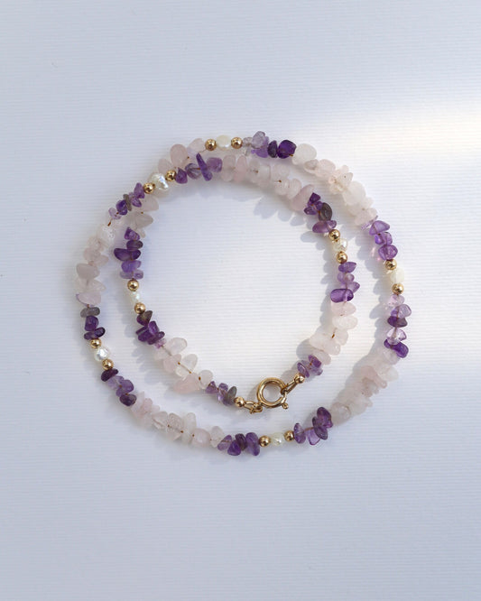 Rose Quartz & Amethyst Necklace | Freshwater Pearls | 14K Gold-Filled