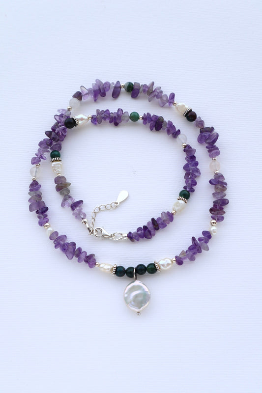 Amethyst & Indian Agate Necklace | Freshwater Pearls | 925 Sterling Silver | Gemstone Jewelry
